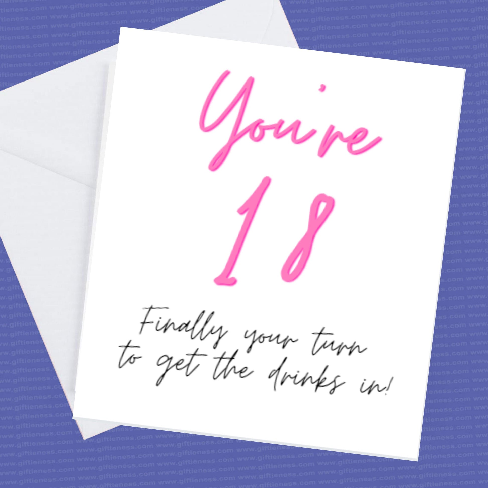 Celebrate turning 18 with this playful birthday card. With the message "finally your turn to get the drinks in", this card not only acknowledges a milestone, but also reminds the recipient of the newfound ability to buy alcohol. Perfect for a fun and lighthearted celebration. Cheers to adulthood!