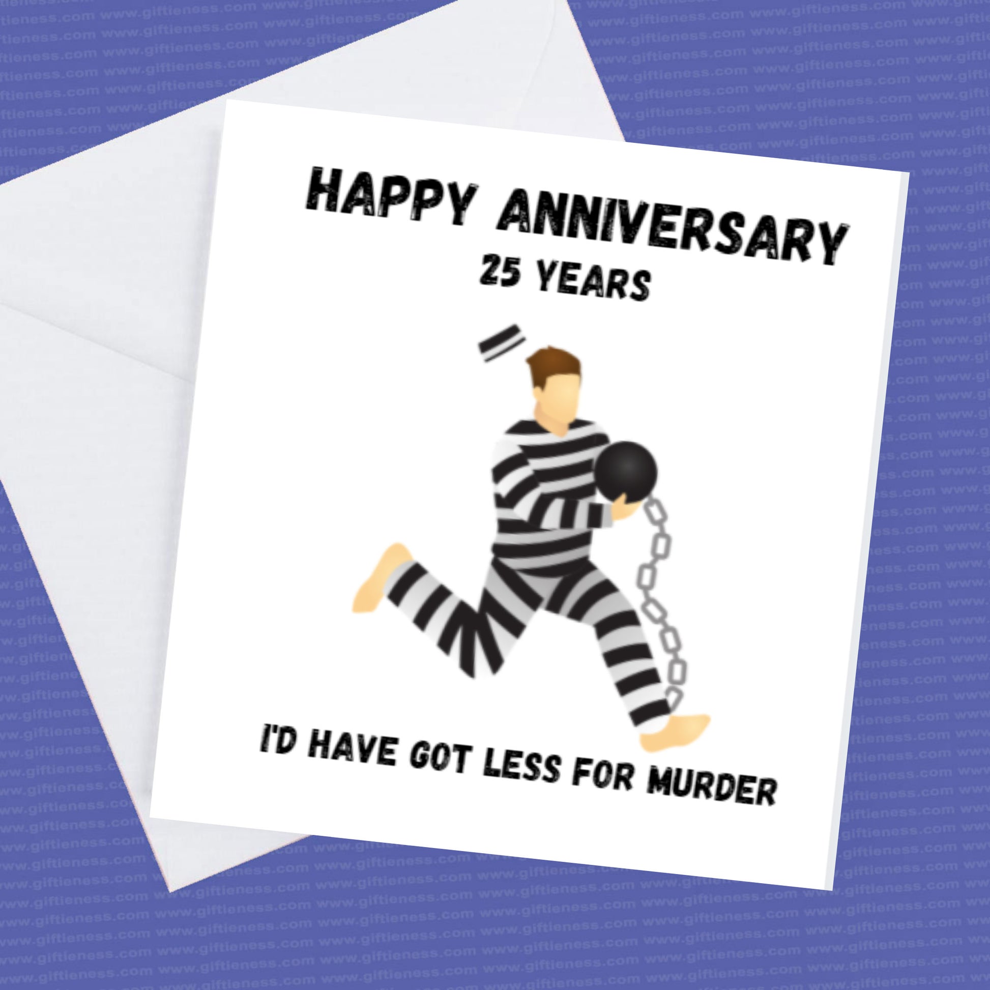 Celebrate your 25th wedding anniversary with this special silver wedding anniversary card "I'd Have Got Less for Murder." Perfect for couples who have survived 25 years of marriage with love and laughter. A fun addition to any anniversary celebration and a great way to reminisce on your journey together.