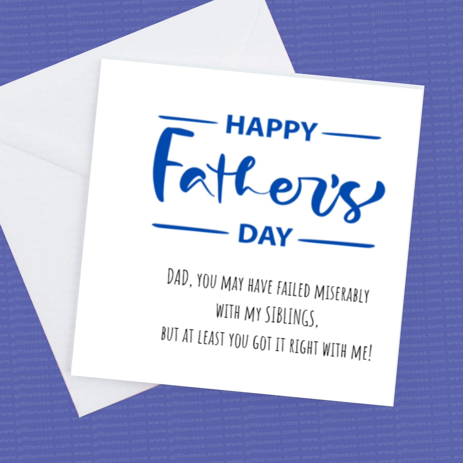 This funny card acknowledges that Dad may have struggled with your siblings, but he got it right with you. Share a laugh with him and showcase your appreciation for his efforts.