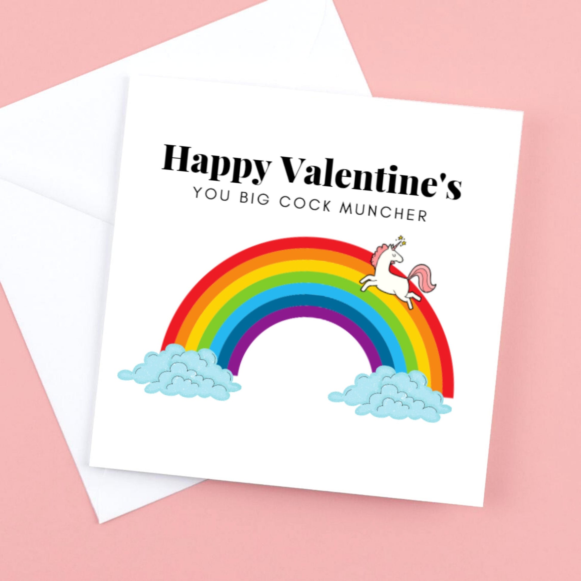 Funny Valentines Unicorn Card, "Happy Valentines you big cock muncher" with rainbow.