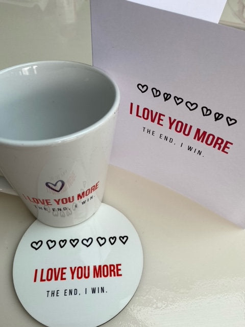 Gift set includes a Latte Mug, Coaster and Card with our " I Love You More" Design.