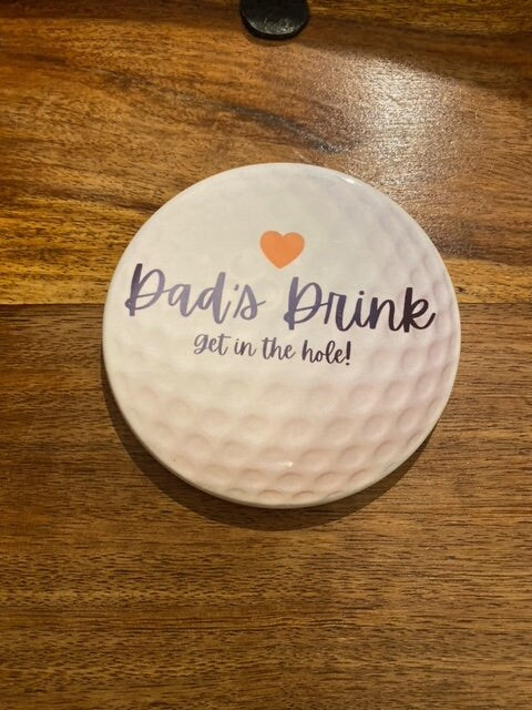 Wooden Coaster printed with golf ball design 'Dads Drink' or I can personalise with any name.